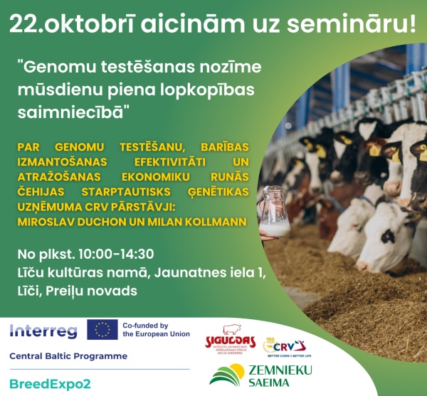 Siguldas CMAS sadarbībā ar biedrību "Zemnieku Saeima" aicina uz otro semināru "Genomu testēšanas nozīme mūsdienu piena lopkopības saimniecībā", kas notiks 22. oktobrī Preiļos un 23. oktobrī Saldū.