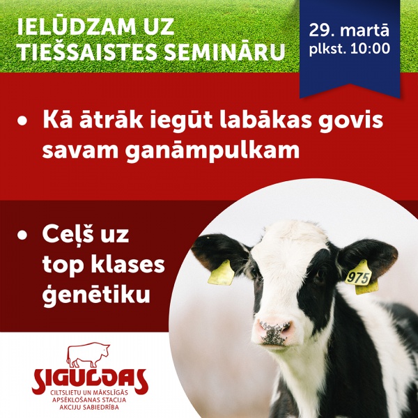 29. martā plkst. 10:00 notiks Siguldas CMAS rīkots tiešsaistes seminārs liellopu audzētājiem.