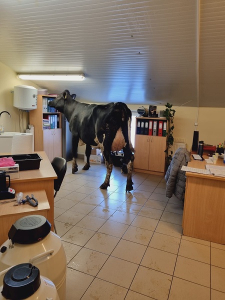 Labi audzinātā pirmpiene pati personīgi bija ieradusies pārbaudīt sev sastādīto pāru atlases plānu un djuāra traukos pieejamos buļļus.